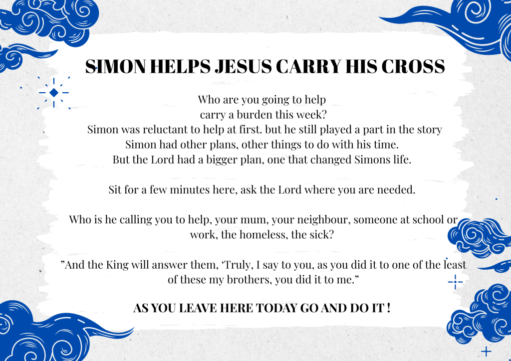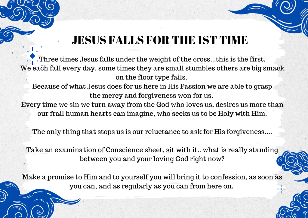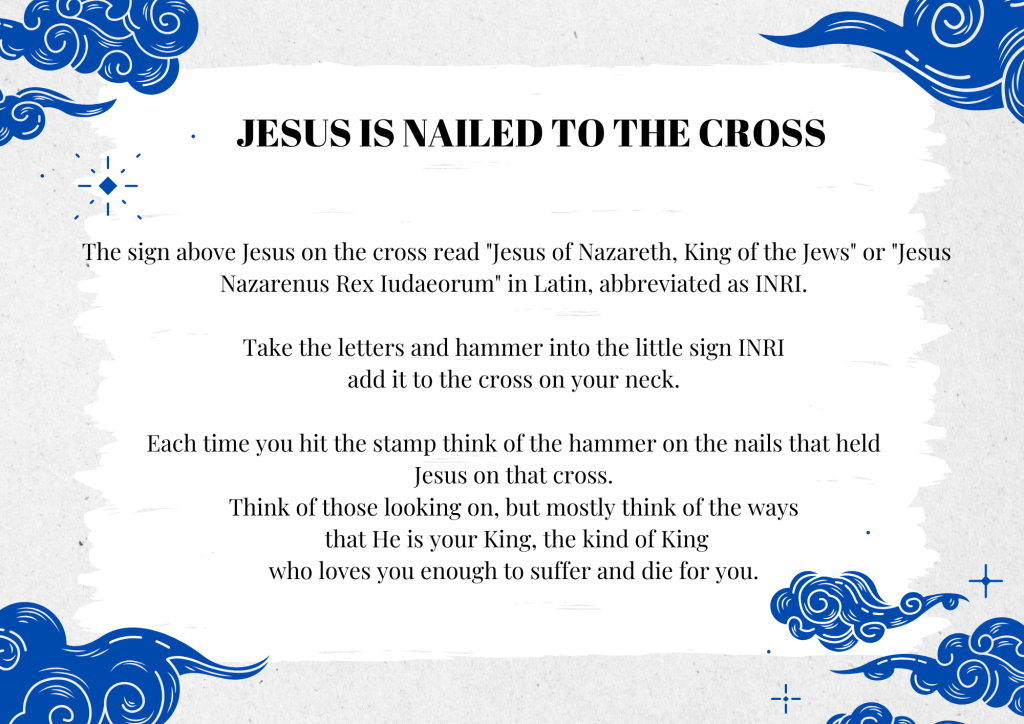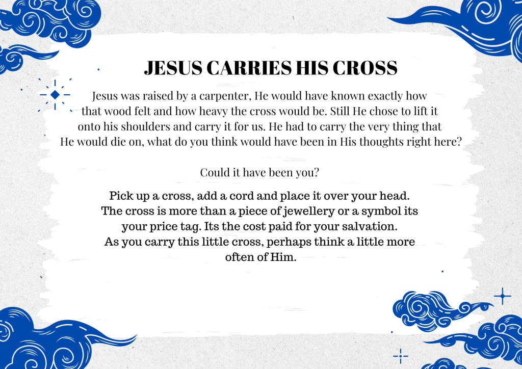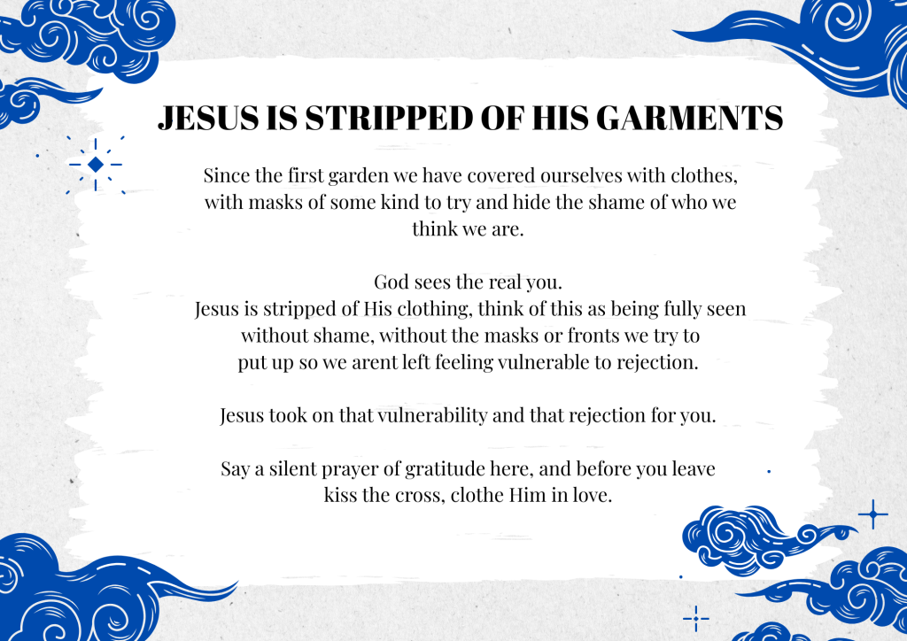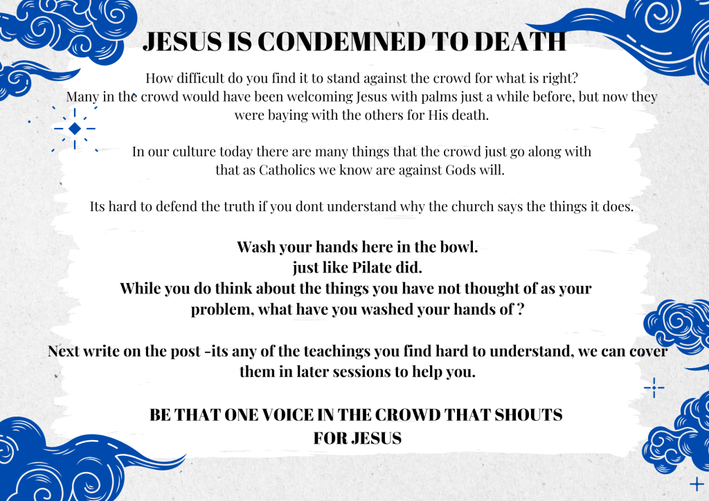 Print each station and place them around your space. It involves some amassing of stuff, however, they can be brought out each year, so once it’s done, pop it in a box for each Lent. Please leave a comment if you’ve tried it, would love to know how it went or any suggestions for improvement. You can download the whole lot here…