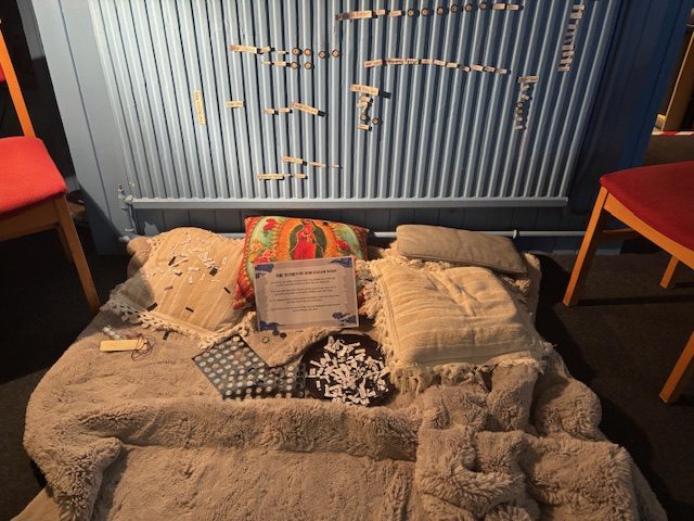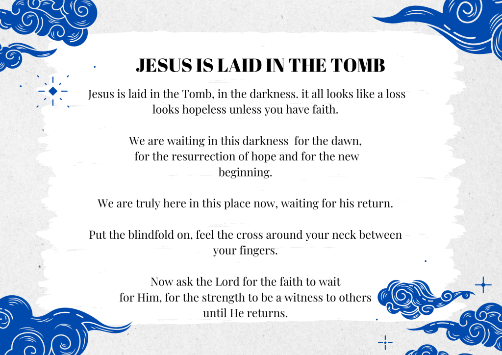 We gathered everyone back together into the room with the lit rosary, we led them into a place of quiet and stillness to read the last guided meditation. Again the Blindfolds really help to keep them engaged with the words rather than each other.