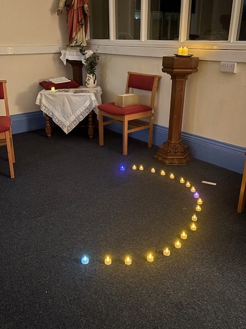 As each Hail Mary is prayed, light one of the tea lights and arrange in the shape of a rosary that is completed by the end. Its lovely to have your final prayer in the same space with the illuminated Rosary.